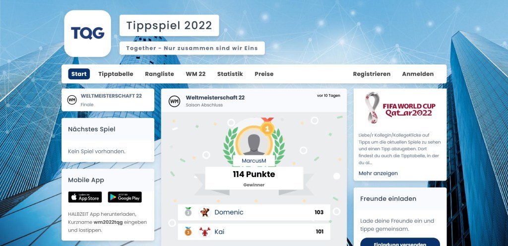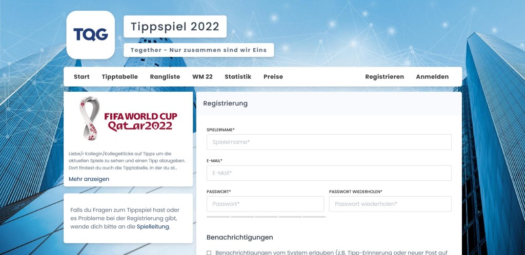 Pünktlich zur Fußballweltmeisterschaft haben wir wieder unser firmenübergreifendes Tippspiel organisiert und freuen uns auf zahlreiche spielfreudige Mitspieler!
