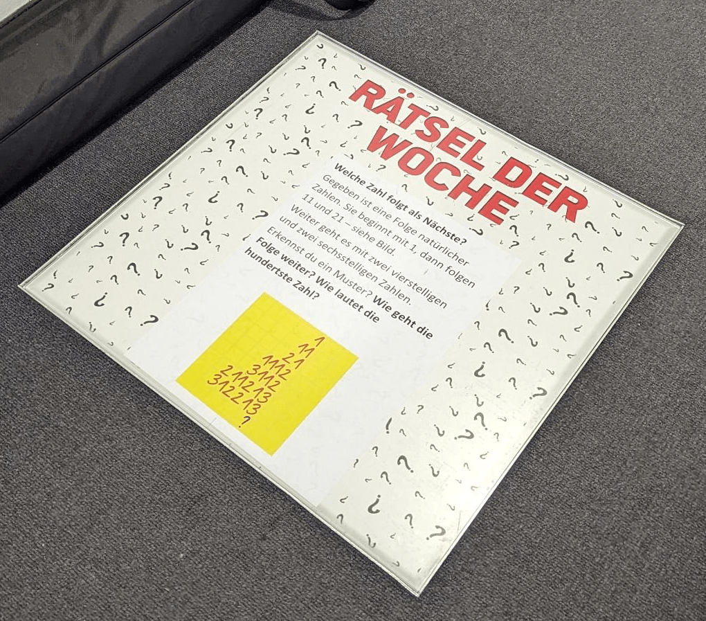 Damit die Synapsen schön frisch bleiben, bringen wir auf dem Büroflur wöchentlich einen Rätselspass zum Knobeln, Grübeln und Fachsimpeln an: Das Rätsel der Woche. Löst Verspannungen und Denkblockaden. Wir wünschen viel Vergnügen beim Auflösen:)