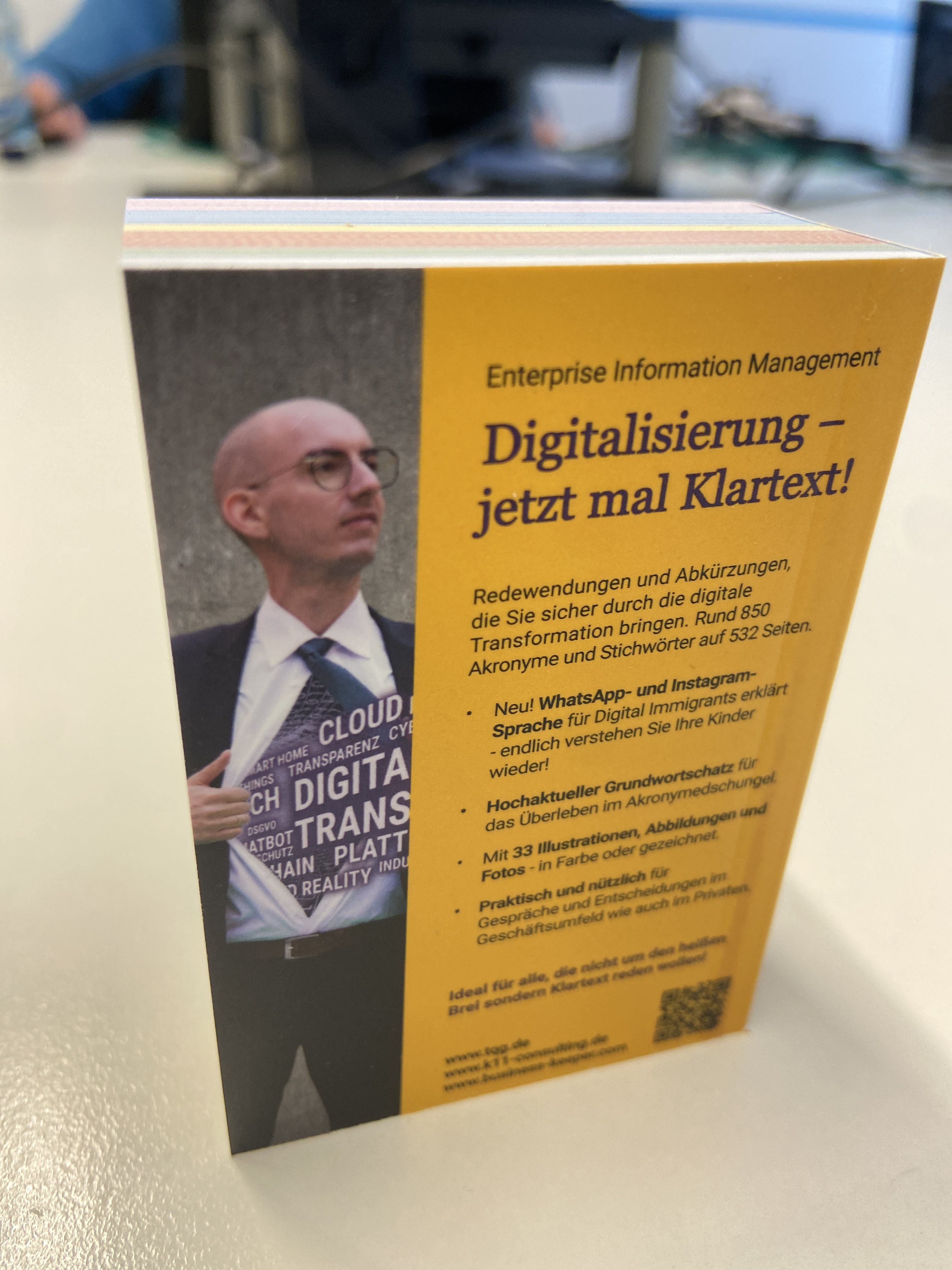 Mit unserem mobilen Taschenwörterbüchlein, welches rund 850 Akronyme und Stichwörter auf 532 Seiten umfasst, kommen Sie sicher und kompetent durch die digitale Transformation. Die zahlreichen Redewendungen und Abkürzungen gehören nach wie vor zum Grundwortschatz aller Digital Natives und Immigrants und sichern das Überleben im Akronymedschungel. Das Taschenwörterbüchlein im Miniformat passt in jede Tasche und ist ideal für alle, die nicht um den heißen Brei sondern Klartext reden wollen!